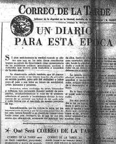 abundante información política, ana-lizada y desmenuzada para su mejor com-prensión. Esta condición de "libertad de acción" le es fundamental e indispensable para sostener y defender los principios esenciales que determinan su aparición. Correo de la Tarde, haciendo honor a su esencia democrática, dará tribuna de opinión a las voces políticas o independientes, reservandose el derecho de estar de acuerdo o no. Hará cátedra democrática y denunciará los vicios de la democracia y la seudodemocracia.