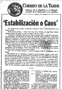 Queremos ser optimistas fundando nuestro optimismo en dos razones: que el gobierno exponga claramente la situación, toda la situación, fijando el camino a seguir, que habrá de ser recto e insospechable, iniciándose con efecti-vos ejemplos en el propio gobierno; y que el pueblo al conocer la alternativa, el camino a seguir y sus dificultades comprenderá el problema y apoyará con su sacrificio temporal para lograr las soluciones definitivas. |