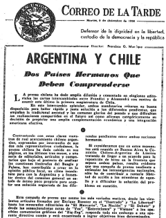 Si consideramos que en estos momen-tos está reunida en Buenos Aires la Comisión Chileno-Argentina de Límites tratando de llegar a un acuerdo para la reposición de hitos en la frontera que separa ambos países, resulta evidente que una campaña de prensa tendiente a estimular las intransigencias naciona-les, sólo ha de contribuir a restarle liber-tad de acción a los miembros de aquella y a dificultar la solución del problema en cuestión.