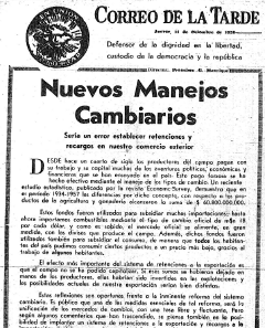 En nuestra opinión esta postura es criti-cable porque: 1º) significaría mantener el sistema de contralor oficial en nuestro comercio exterior, con todos sus efec-tos nocivos ya experimentados; 2º) establecería diferencias según el criterio de los funcionarios y no según los mecanismos naturales del mercado, como debe ser; 3º) desalentaría nueva-mente las exportaciones, cuya promo-ción debe ser un objetivo esencial de toda política que se proponga superar nuestra actual situación económica. Además, los recargos a las importacio-nes producirían un incremento en los costos de producción, con la conse-cuencia ulterior de elevar aún más el costo de la vida e impedir la expor-tación de productos manufacturados. Todas esas razones nos inclinan a pen-sar que sería un error establecer reten-ciones y recargos en nuestro comercio exterior. |