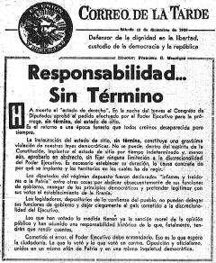 La instauración del estado de sitio, sin término, constituye una gravísima violación de nuestras leyes democrá-ticas. No se puede, dentro del espíritu de la Constitución, implantar el estado de sitio por tiempo indeterminado y, menos aún, aprobarlo en abstracto, sin fijar ninguna |